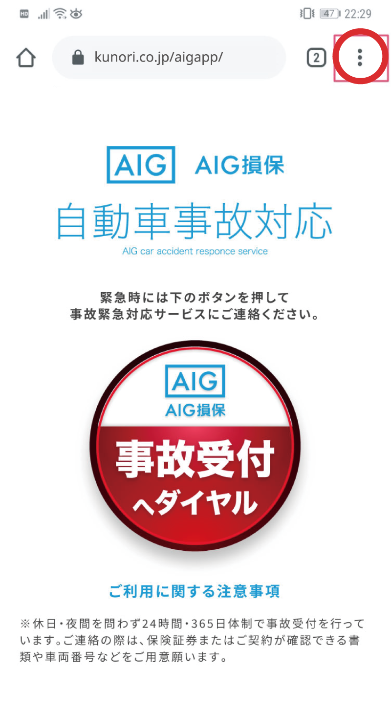 AIG損保 自動車事故対応サービスはスマホのホーム画面に登録しておくことで、事故の時にホーム画面のアイコンをタップして表示されたボタンをタップするだけで自動車事故対応デスクに電話できるサービスです。